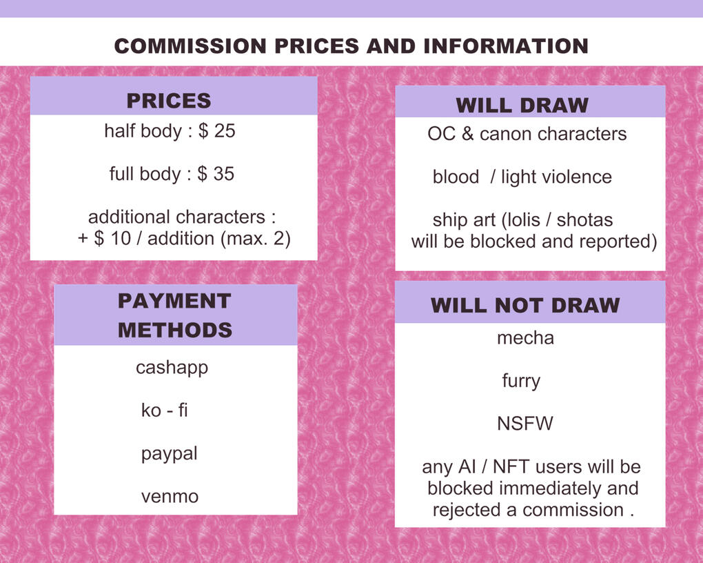 COMMISSION PRICES AND INFORMATION IIPrices : Half Body for $25 ; Full Body for $35Payment Methods : CashApp ; Ko - Fi ; PayPal ; VenmoI Will Draw : Oc & Canon characters ; Blood / Light Violence ; Ship Artwork *I Will Not Draw : Mecha ; Furry ; NSFW ; Anything that is used for the intention of creating an NFT / AI-created image *( please read TOS for more details )