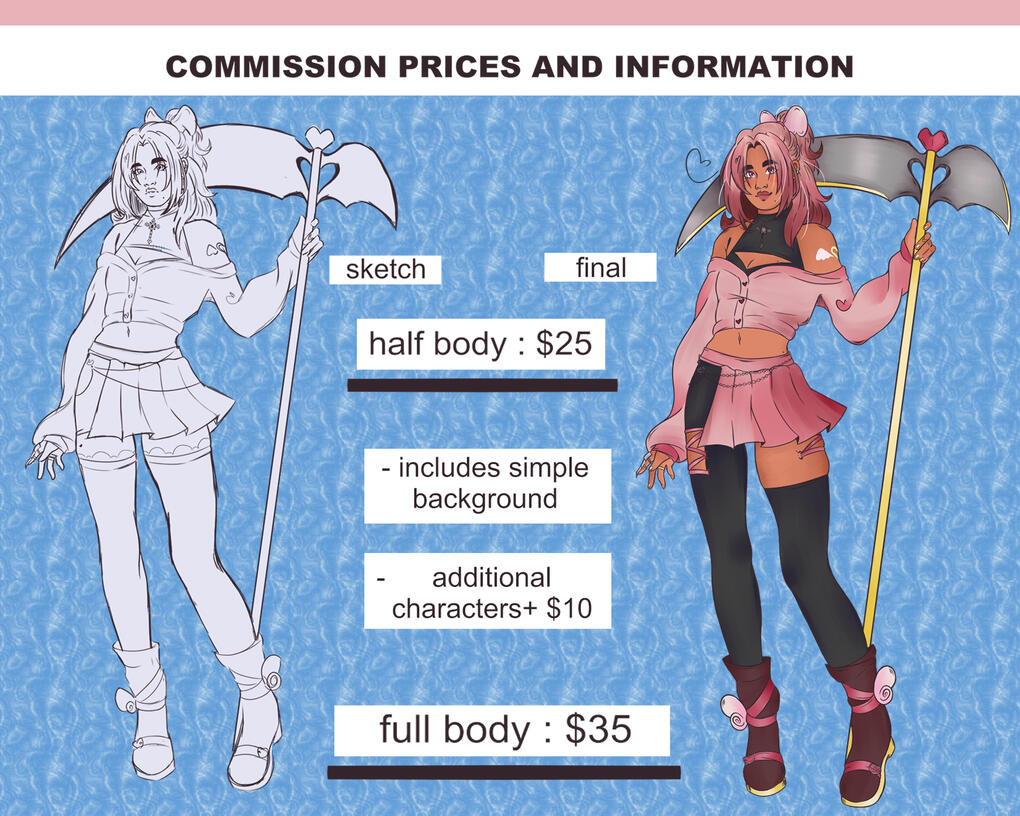 COMMISSION PRICES AND INFORMATION IHalf Body : $25Full Body : $35- includes simple background- additional characters are $10 , with a max. of 2 (~ + $20 )